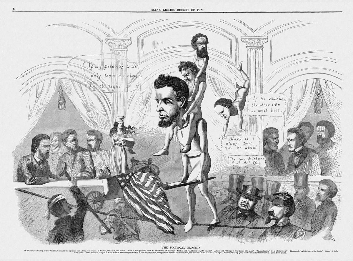 And still, the name endures. In 1864, Abraham Lincoln compared himself to "Blondin on the tightrope, with all that was valuable to America in the wheelbarrow he was pushing before him." A political cartoon in *Frank Leslie’s Budget of Fun* depicted Lincoln pushing that wheelbarrow, carrying two men on his back—Stanton and Welles—while foreign powers and generals looked on. The metaphor was perfect: the nation balanced on a thin line, the president the only one steady enough to cross. Blondin, whether dangling over Niagara or trundling a stove across a void, had become more than a performer. He was an archetype. A man who walked where others feared to stand. A poet of peril. A legend spun from rope and nerve.