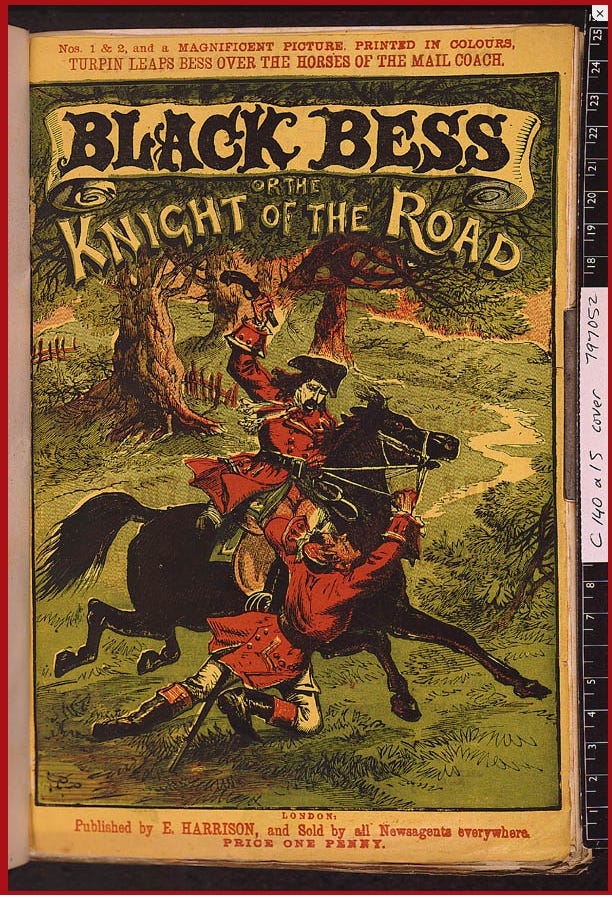 These weren’t shelved alongside Austen or Trollope. They were hidden under mattresses, traded in schoolyards, read surreptitiously by candle stubs. They were also known as penny numbers, a term reflecting their serialised format, issued in weekly or biweekly parts, each a self-contained cliff-hanger designed to ensure the next purchase. *“Next week: The Secret of the Iron Coffin!”* promised the cover of *Black Bess; or, The Knight of the Road*, a 254-episode glorification of Dick Turpin in which the highwayman wasn’t hanged until page 2,207, a feat of narrative procrastination rivalled only by the actual delays of 18th-century justice. Vendors called them out in the streets: “Latest dreadful! Murder in Whitechapel! Escape from Newgate!” Among the alternative titles floated by publishers were *naughty novels*, *filthy newsbooks*, and *dirty foldabouts*, though the official catalogues preferred the vaguer *penny something*, letting the reader’s imagination do the work. *Thou-shalt-nots* appeared as a euphemistic label in certain temperance pamphlets, while street hawkers used *“Don’t look in there, mother’s”* as a sly pitch, winking as they passed a volume to a youth whose mother was, conveniently, out of earshot.